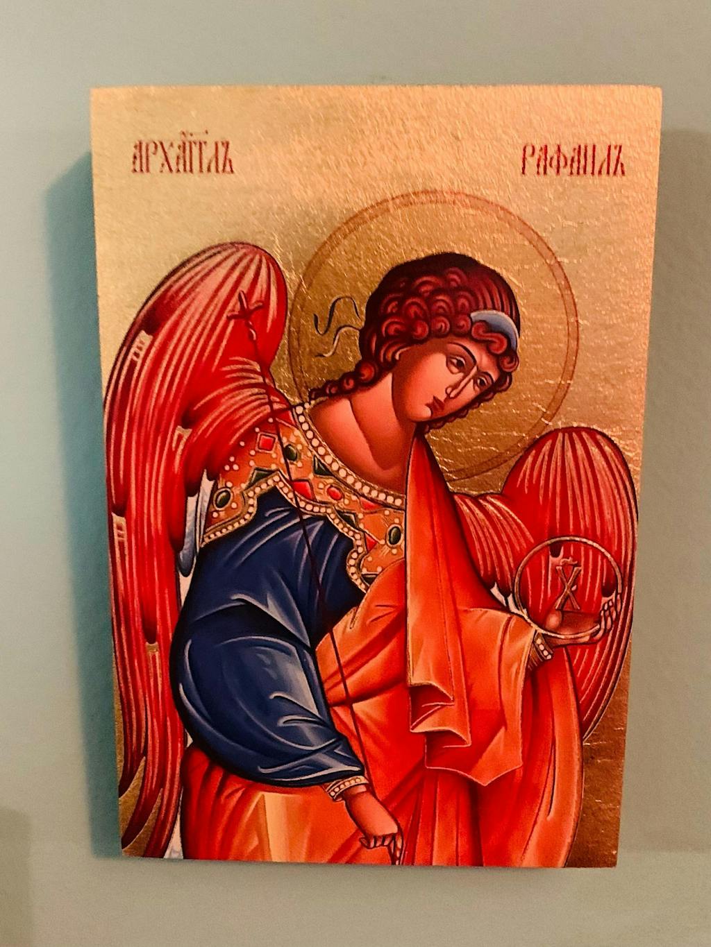 Die Ikone des Erzengels Raphael zeigt den göttlichen Boten Gottes – den Heiler von Körper und Seele. In der christlichen Tradition gilt er als Patron der Reisenden, Ärzte und Kranken. Seine ruhige Präsenz schenkt Trost und Vertrauen in Gottes Fürsorge. Diese Ikone ist ein Zeichen des Glaubens und der Hoffnung.