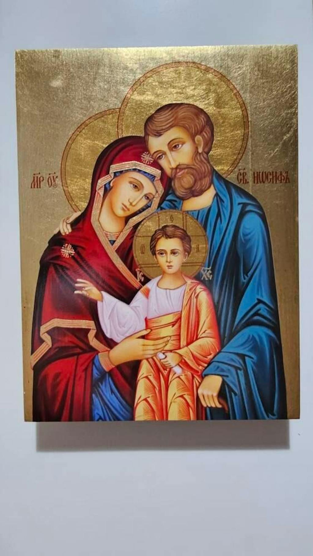 Ikone der Heiligen Familie – Maria, Josef und das Jesuskind zeigt die zentrale Wahrheit des Glaubens: Gottes Gegenwart in der Familie. Dieses Bild strahlt Wärme, Liebe und Glauben aus. Maria und Josef umarmen Jesus, die Quelle des Heils und Segens.