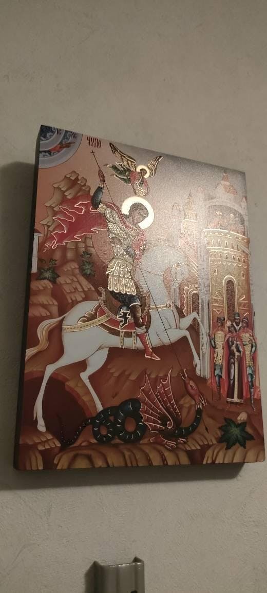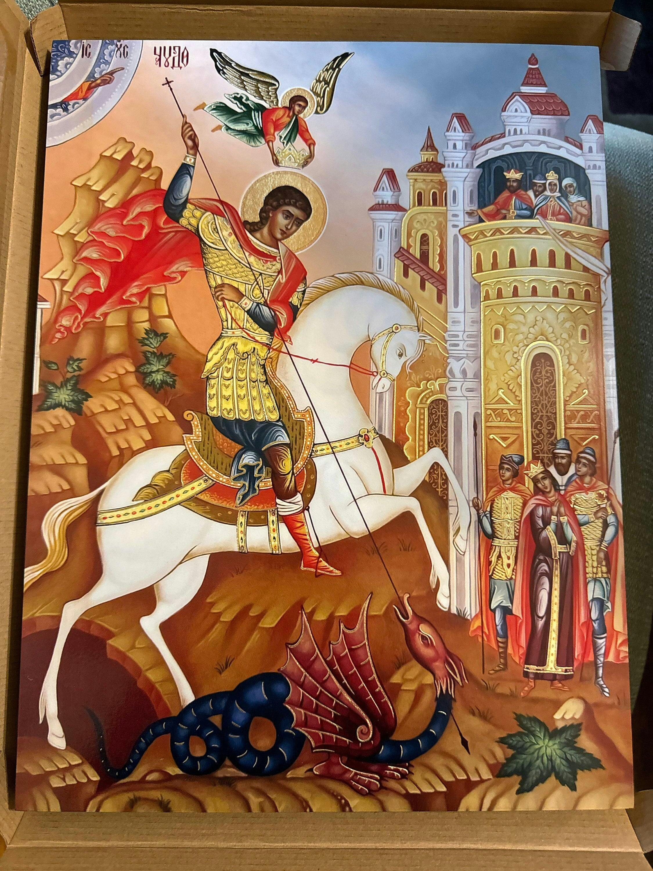 Adaptée aux foyers, chapelles, monastères et comme cadeau spirituel pour les soldats, scouts et ceux portant le prénom Georges.