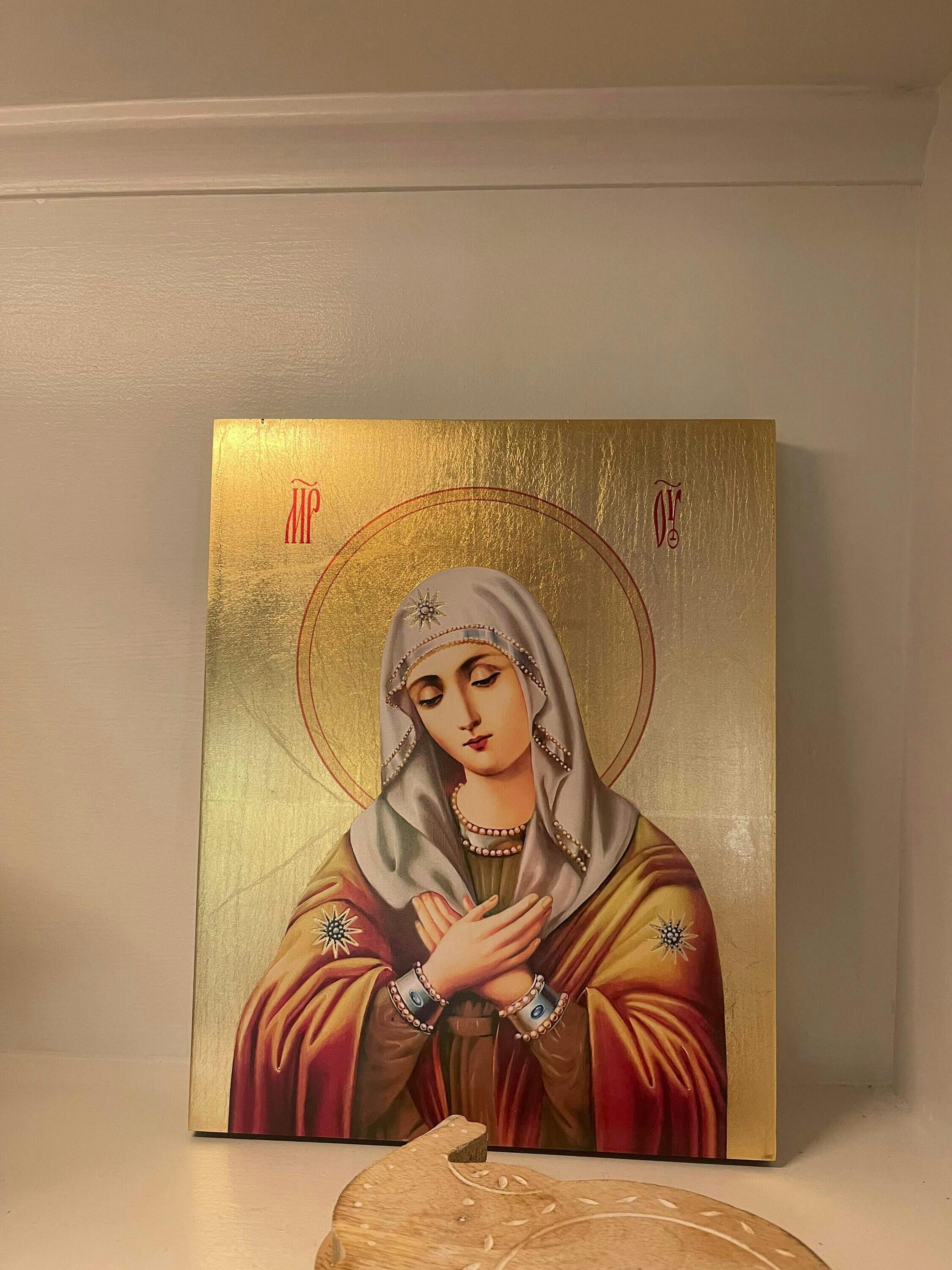 This peaceful Virgin Mary icon shows Mary with her eyes closed, head bowed, and arms crossed in prayerful humility. Printed on solid linden wood and adorned with gold-tone metal leaf, the icon reflects grace, inner peace, and maternal warmth. A thoughtful gift for any spiritual occasion or as elegant religious home decor. Includes hanger and certificate.